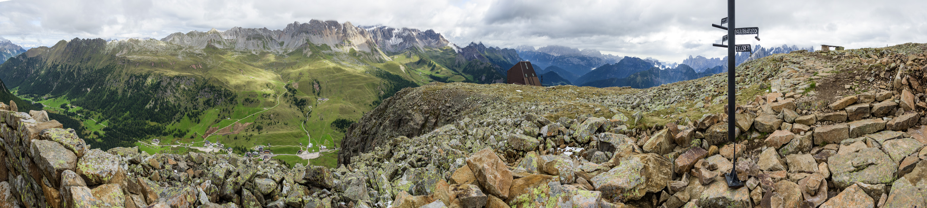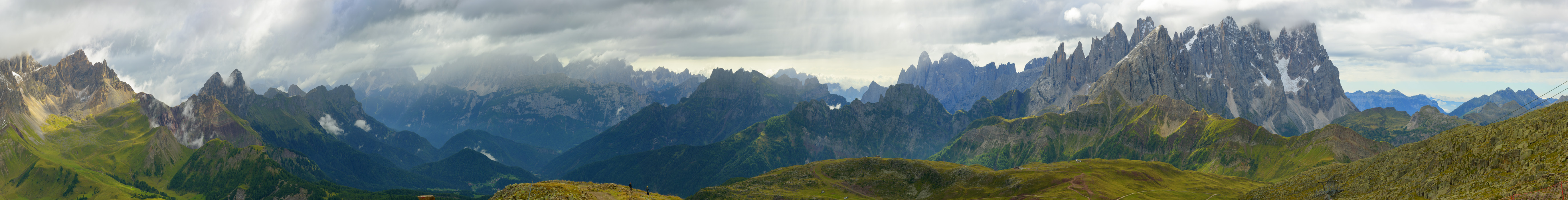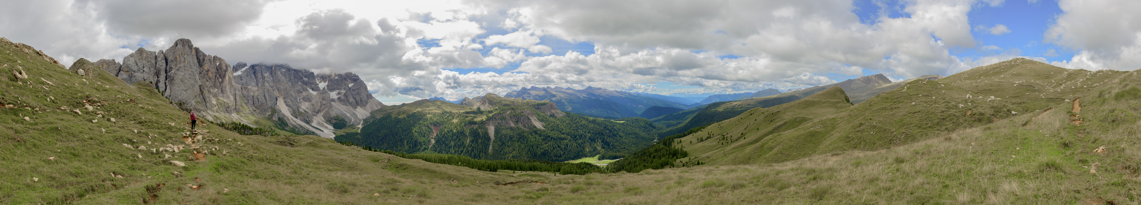 From Col Margherita. In this panorama you can see - way to the left - the green meadows we'd decended the day before from Forca Rossa. Panning right gives views of what we have ahead. Ups and downs through some pretty rugged mountains.