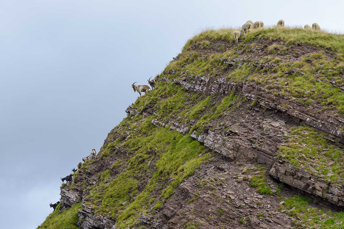 Wild goats hanging out with sheep.